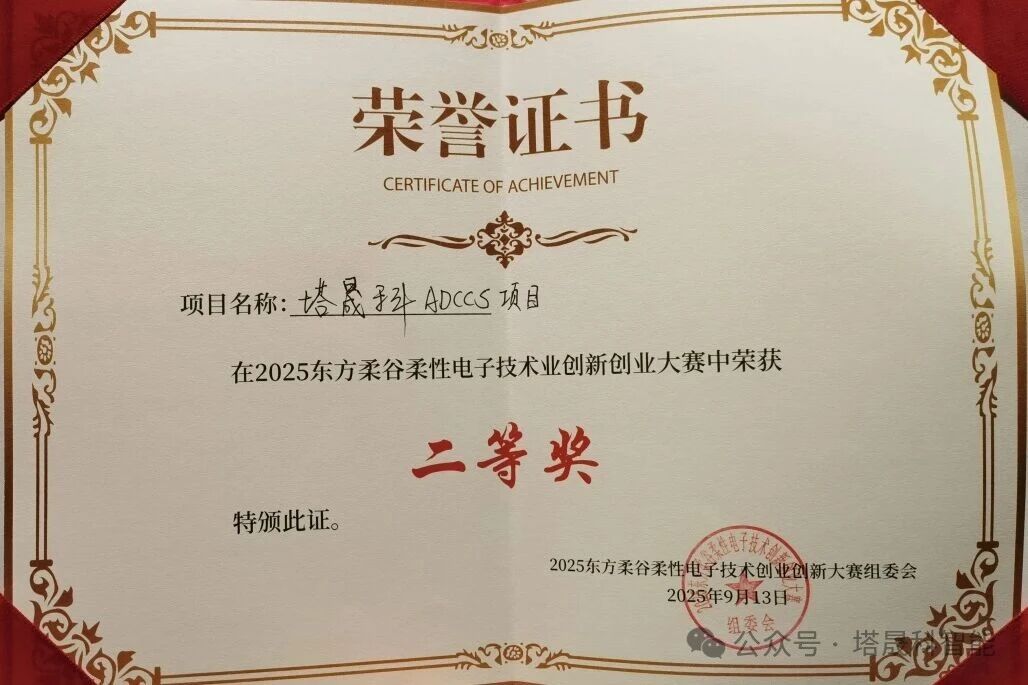 塔晟科智能此次同步斩获大赛二等奖与 “红船杯” 决赛直通车资格,不仅是大赛对 ADCCS 系统技术创新性、产业化价值的双重认可,更标志着公司在 “柔性电子 + 无人驾驶” 跨界融合领域的探索,已获得嘉兴产业生态的高度青睐,为后续深度参与区域产业协同奠定坚实基础。(塔晟科智能获得2025 东方柔谷大赛二等奖)