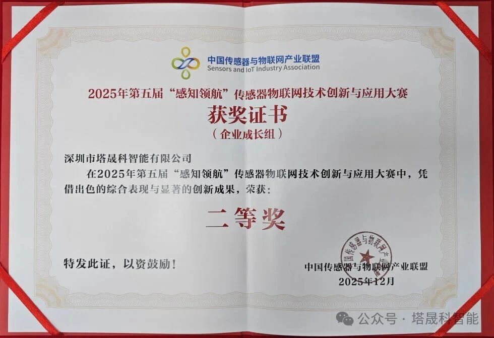 2026新年伊始,塔晟科智能就收获新年第一份荣誉。塔晟科智能凭借核心产品“高精度车规级底盘姿态传感器”,从近千个参评项目中脱颖而出,成功斩获第五届 “感知领航” 传感器与物联网创新应用大赛二等奖,以硬核技术实力赢得行业权威高度认可。