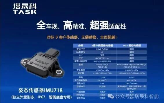 IMU718姿态传感器不仅能直接平替 Bosch 外置传感器,更在性能上实现全面超越—— 无论是姿态感知精度、环境适应性还是稳定运行时长,均达到行业领先水平,具备极强的市场竞争力。更值得关注的是,该传感器额外支持 Autosar NM 网联管理,完美兼容 Autosar Tsyn 等核心功能,再搭配塔晟科自主研发的高性能姿态解算算法,可实现毫秒级精准姿态解算输出,为无人车在复杂路况下的安全行驶、精准定位与高效运营提供了全天候、高可靠的核心技术支撑。