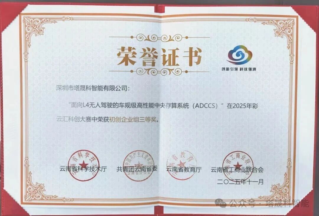 作为云南省规格最高、影响力最大的品牌科创赛事,本届彩云汇大赛吸引全国 1635 个优质项目参赛,最终评选出 177 个获奖项目,塔晟科智能的技术实力在激烈竞争中脱颖而出。大赛技术评审组评价:“ADCCS 系列精准切入 L4 级自动驾驶的‘算力 - 通信 - 安全’核心痛点,技术路线领先,商业化落地前景清晰。”