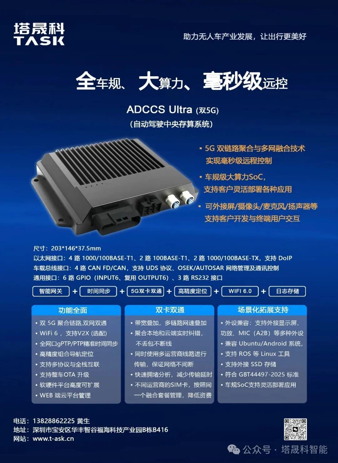 塔晟科智能倾心打造的ADCCS产品系列,ADCCS 产品系列以 “车规级+ 大算力 + 毫秒级远控” 为核心竞争力,实现了多项关键技术的深度融合与创新应用。产品融合了5G双网双通、时间同步、以太网/CAN网关路由、高精度定位、高性能IMU、WiFi 6/BLE 5.0通信与日志存储等功能于一体,在满足功能安全、信息安全加密传输与系统级冗余设计要求的同时,优化电子电气架构,使部署效率提升 40% 以上,同时将硬件集成成本降低 30%,从根源上解决行业 “部署难、运维贵” 的痛点,帮助无人车行业降本增效。